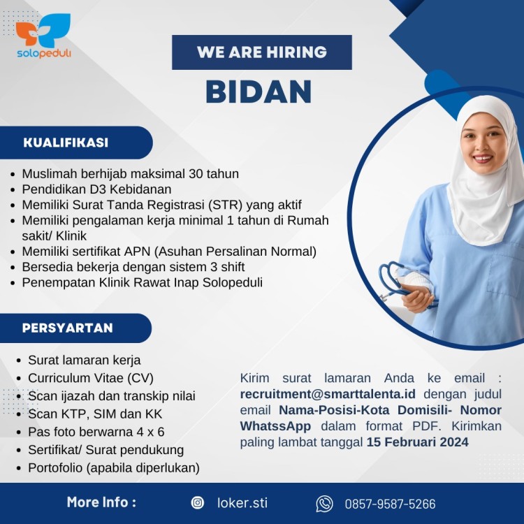 Lowongan pekerjaan Bidan di klinik rawat inap solo peduli