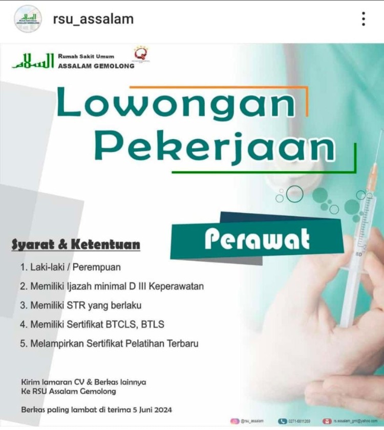 Lowongan Pekerjaan Perawat dii RSU Assalam Gemolong